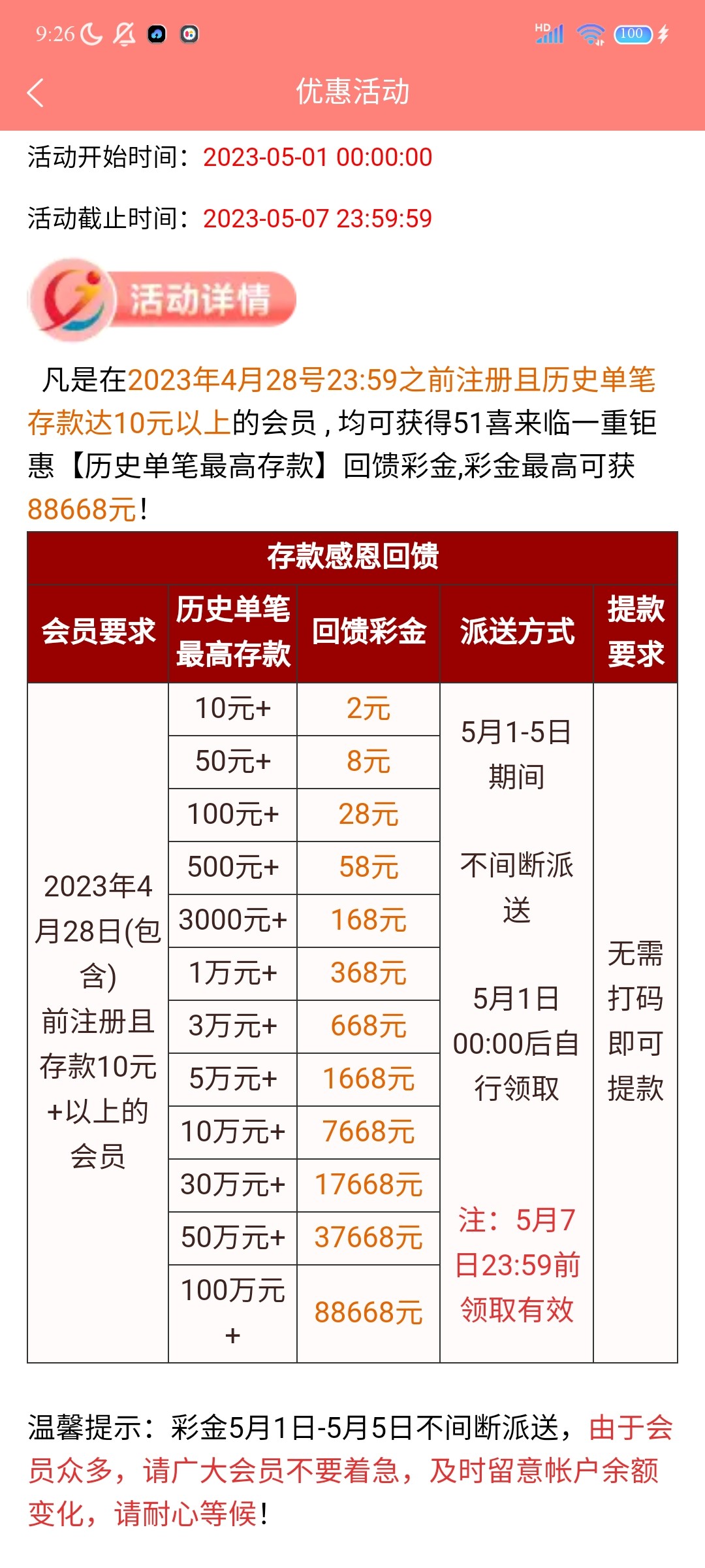 老用户充值过的到5月1号看下图领回馈彩金